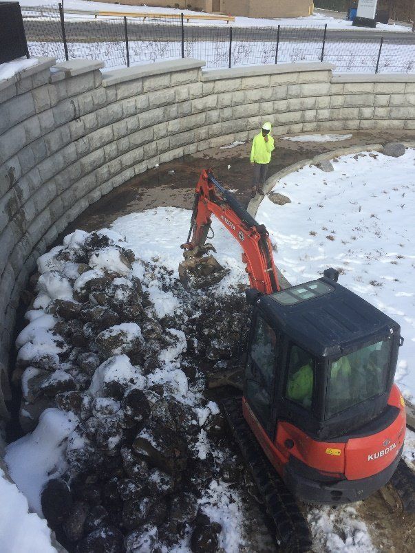 E&S Services with the help of Environmental Design Group had a mission to help delay the erosion of the base of a retention wall on this particular site. We took an abundance of sandstone boulders that were used for the construction of a splash pool in the fall out area and created decorative check dams to slow the flow of the water down and make for a very unique and artsy urban design while doing so. We also mortared the base of the wall as a temporary fix to keep water from undercutting the base while the sewer district comes up with the permanent fix to an existing problem. This project also included removing trees, installing grates, cleaning out the HDPE pipes, and some basic landscaping. Overall everyone was very happy with the quick response time to keep this site from failing while designers work on the next steps in a permanent retrofit.